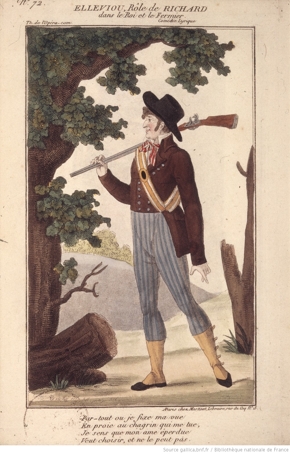 The action takes place in Sherwood Forest, several centuries after Robin Hood.  The farmer, Richard, gamekeeper inspector of the forest, is beside himself with jealousy and worry (“Je ne sais à quoi me résoudre”); his fiancée, Jenny, entered the castle of “Milord”, a lustful despot aptly named Lurewell, and Richard fears the worst (“D’elle même, et sans effort”).  Jenny escapes Milord’s clutches, shinning down the traditional set of knotted sheets; she reassures Richard that she didn’t suffer a fate worse than death, in an aria that could have been written by Boieldieu or Auber; and the couple are united.  That’s the first act.