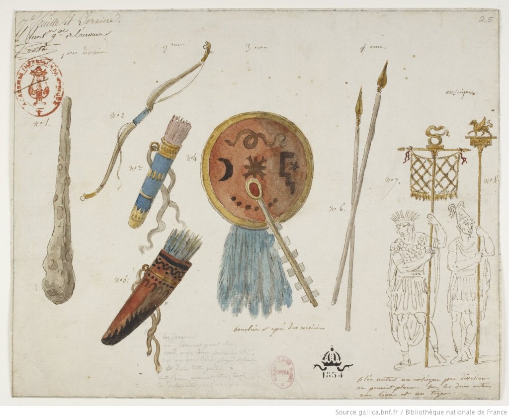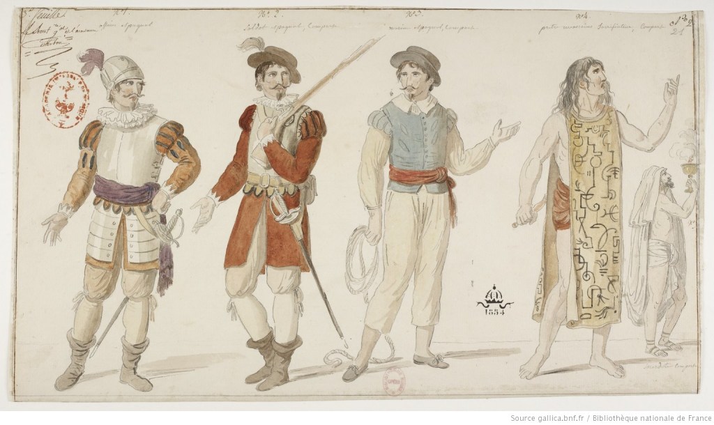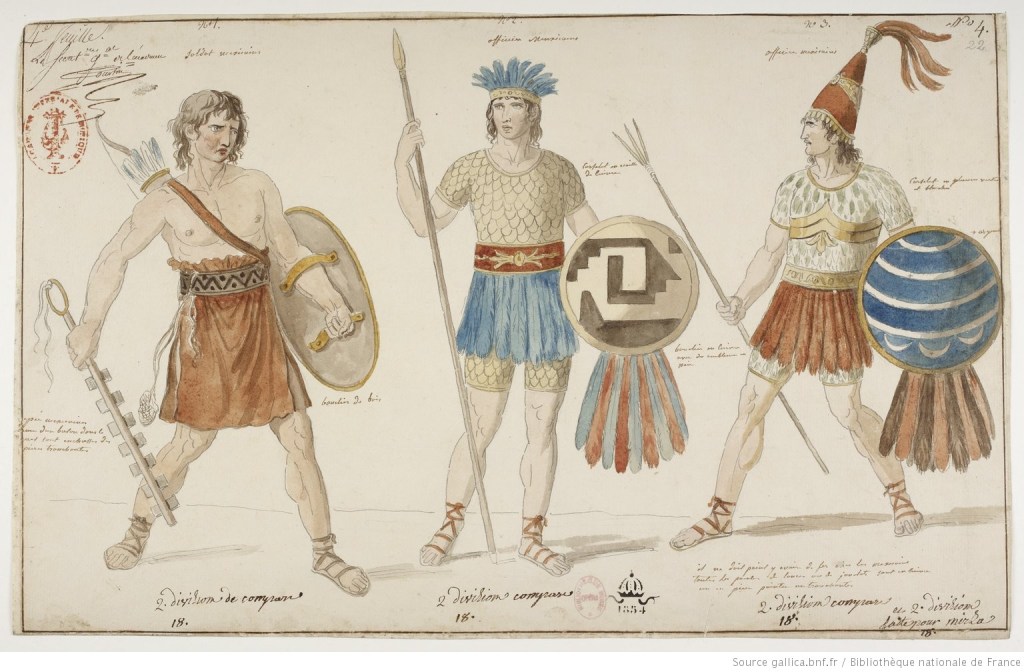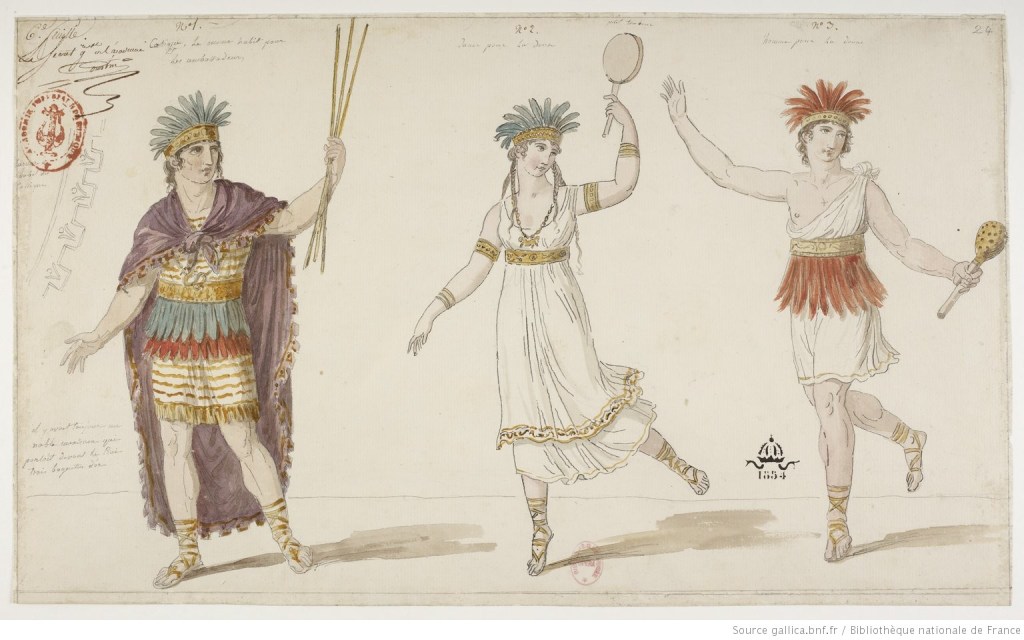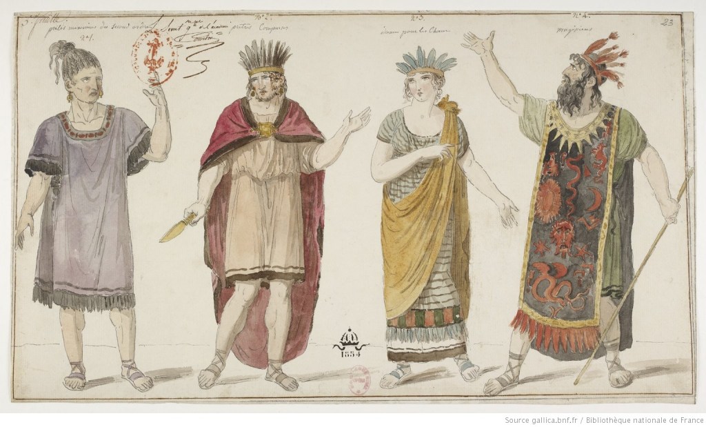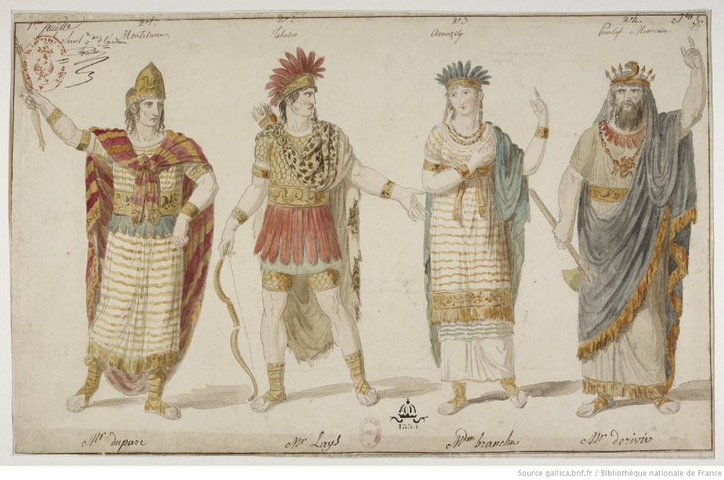 1817 version costumes: N° 1 – Montesuma. M. Duparc ; N° 2 – Telasco. M. Lays ; N° 3 – Amazily. Mme Branchu ; N° 4 – Pontife mexicain. M. Derivis.