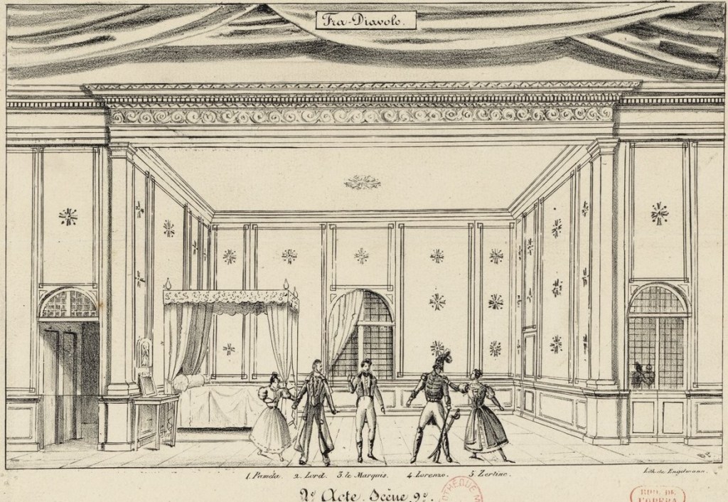Other important papers were hostile. Le Journal des débats (30 January 1830) considered Fra Diavolo markedly inferior to La Muette de Portici or La Fiancée; it was probably hastily produced to assist the Opéra-Comique. “This time, they were wrong; let’s hope they get a brilliant revenge soon, and their proven talent promises it.” Auber’s music was written with care, as far as style was concerned; a quintet in Act I was agreeable and piquant, although the means employed were not new, and the last finale was treated with great skill. For the rest: “A series of very insignificant songs, a jolly chorus of soldiers, a very mediocre trio, an Act I finale where the weak sounds of a few worn-out voices could not emerge through the accompaniment, an aria written for Chollet [Fra Diavolo].” The singing at that theatre was bad – enough, the critic suggested, for the police to intervene if that level of performance continued – and it was rare to find music there.