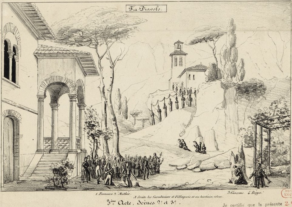 “History describes Fra Diavolo as a savage and coarse brigand,” wrote Le Figaro; “here, he is an honest thief, a villain of good taste, who appears graceful, who pays court to the ladies, and who speaks like a member of high society. M. Scribe makes him seem a rose-coloured bandit, whom you would take, upon my word, for a very decent man, were it not for a few tricks, such as stealing jewels, caskets, billets, and other kind actions which are seldom practiced among well-bred people. Basically, under his seductive exterior, this thief hides a heart of rock.”