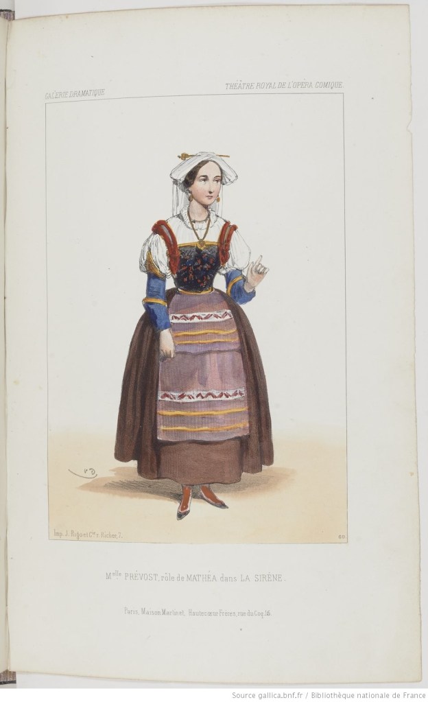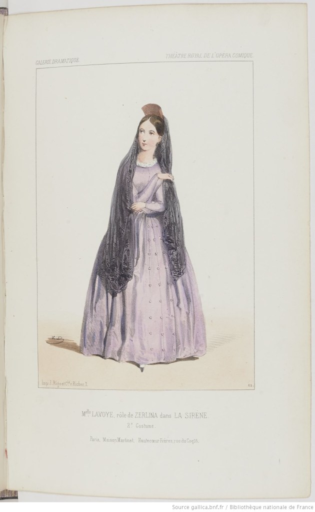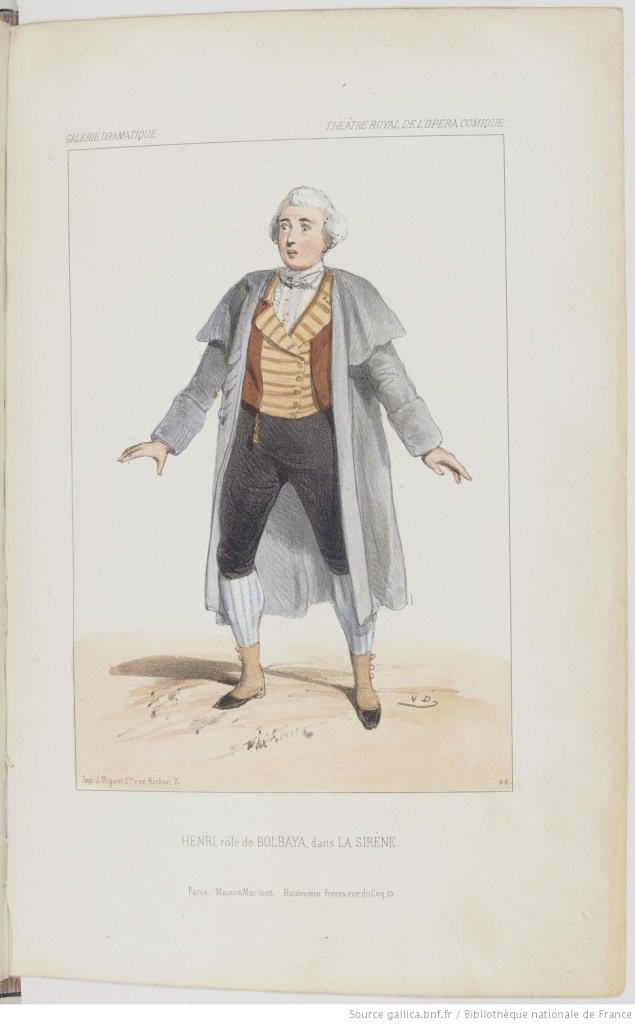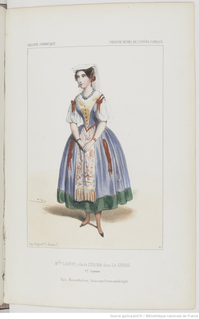 La Sirène was the first work Auber wrote for the Opéra-Comique’s new prima donna, Louise Lavoye, whose high-pitched voice, Letellier notes, could rise to a high D; Zerlina was one of the most virtuosic parts Auber ever composed. Jouvin[ii], however, describes her voice as “dry and angular, not very pleasant, but confident, well versed in all the difficulties of singing, directed by a talent full of will and fortitude. One was not always charmed by listening to her, but one was always calm. When the singer’s voice performed a diatonic or chromatic scale, it sometimes seemed as if she were sweeping the listener’s ear along an even-toothed saw. However, one ended up getting used to this torture of a high or sharp vocalization, and, when the ear was sufficiently seasoned, one did justice to the maestria and the clever mechanism of the young singer.”