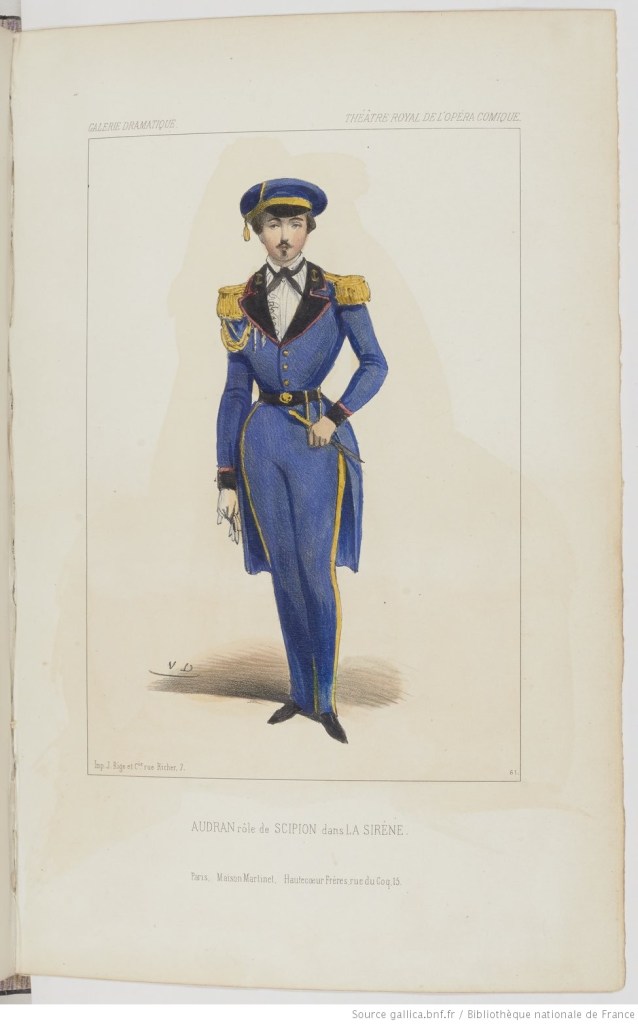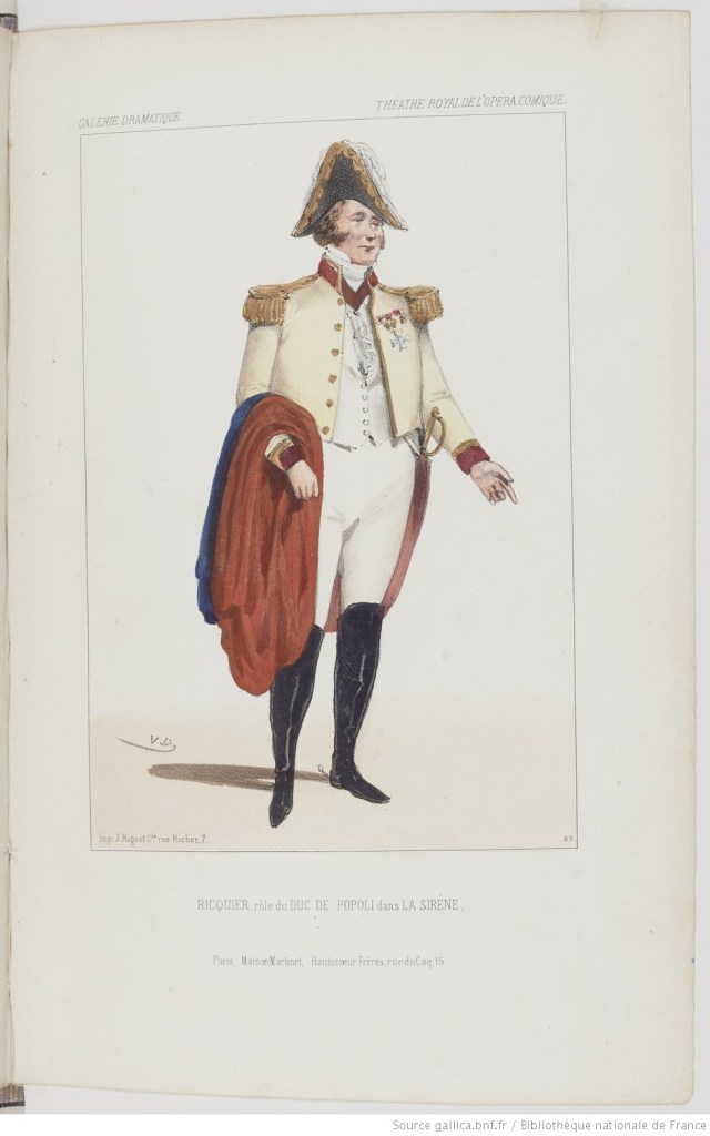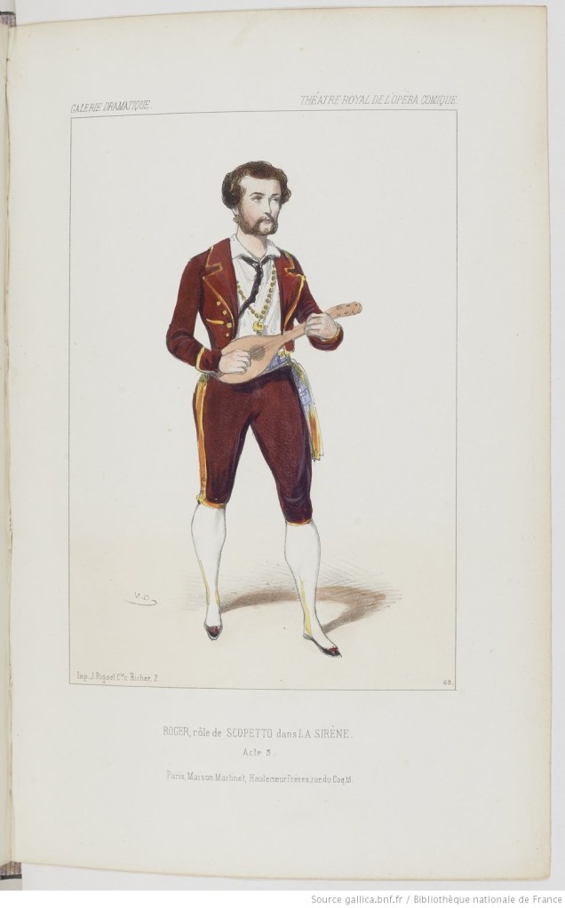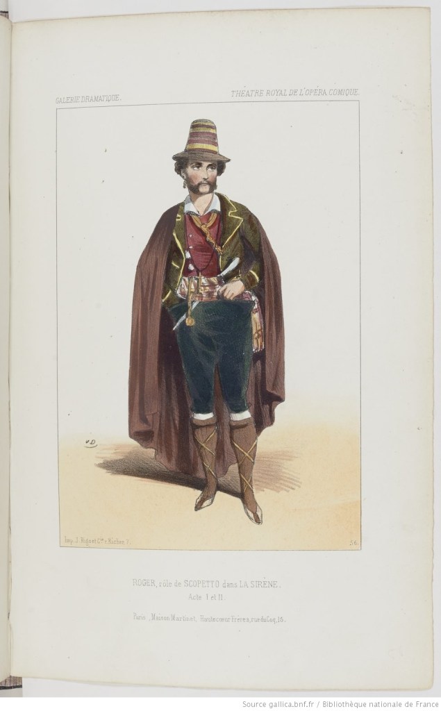 [iii] Jouvin, op. cit., p. 84 : « Scopetto, de la Sirène, a été, sans comparaison, le meilleur rôle de Roger, lui, qui n’en a créé que d’excellents à ce théâtre. Quel naturel, quelle sensibilité, quelle brusquerie sympathique dans ce caractère du fils de Marco Tempesta, bandit par héritage et honnête homme pour son propre compte! On ne fit jamais un personnage plus vrai d’un rôle plus faux. »