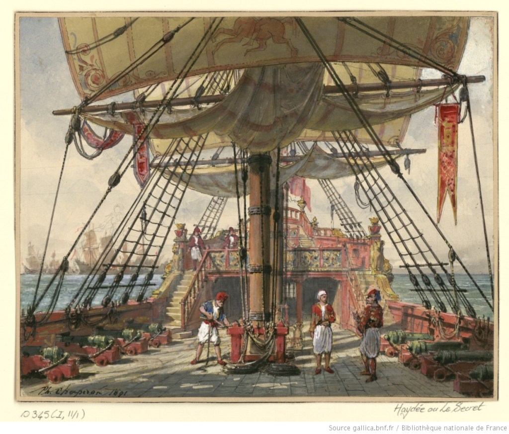 The opera takes place in Dalmatia and Venice during the early sixteenth century, during the wars against the Turks. The admiral Lorédan Grimani is troubled by guilt. Some years before, he cheated at dice to stave off ruin, and his best friend, the senator Donato, lost all his money, and killed himself. To make amends, Lorédan has adopted Donato’s niece, Rafaëla, as his ward, and intends to marry her – not because he loves her, but to protect her. Rafaëla loves Donato’s son Andréa, who serves incognito as a captain in Lorédan’s fleet, and one day intends to be as great as the admiral. The naval officer Malipieri also wants to marry Rafaëla, but Lorédan has refused him. Malipieri serves Lorédan, but only to serve his turn upon him; he is a spy for the Council of Ten, envious of the admiral, and hates him deeply. Also in Lorédan’s household is the Greek slave Haÿdée, a Cypriot prince’s daughter, once owned by Malipieri, and ransomed by Lorédan, whom she loves.