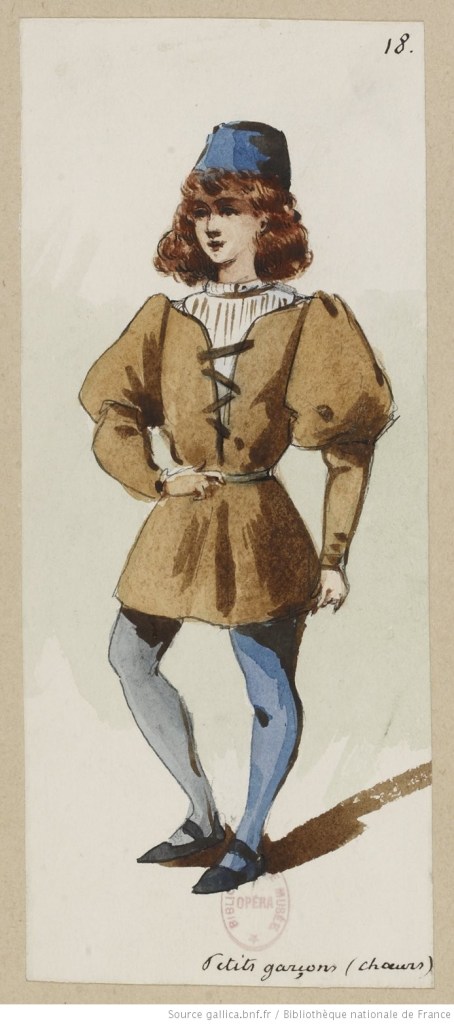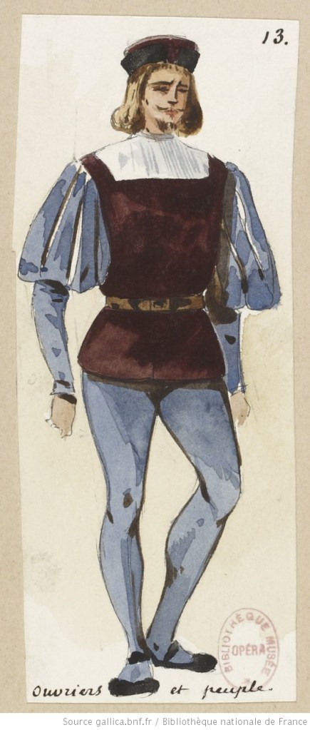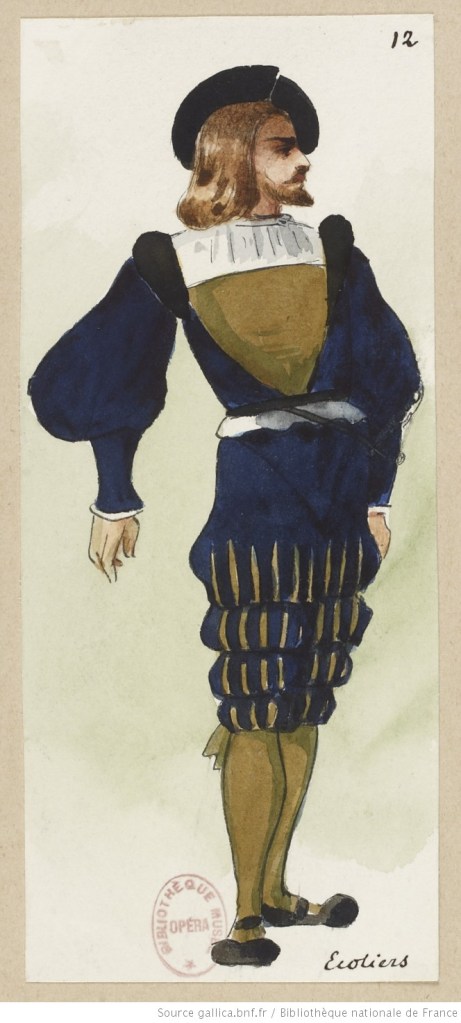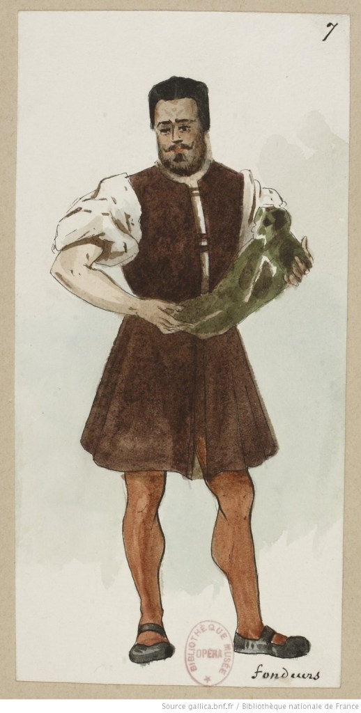 Saint-Saëns had been an advocate of Wagner’s music – he attended the first performance of the Ring at Bayreuth in 1876 – but he was frustrated with the idolatrous worship of Wagner, wagnéromanie. “It seemed to him,” Huebner writes, “that a hegemony of Wagnerian taste had developed in France that would choke pride in its indigenous musical tradition and, in turn, undermine its musical development” (p. 199). He and Gallet envisaged a series of operas based on French history (beginning with Étienne Marcel, 1879) as a retort to encroaching Wagnerism – but Saint-Saëns, like many of his contemporaries, had adopted a quasi-Wagnerian, through-composed style, without formal “numbers”, in which melodies arise organically out of the text. “All my operas have been written using the same method, which broadly consists of using Wagnerian techniques that are easily integrated into my disposition, whilst retaining, in many aspects, my outlook and, above all, my own style, in as much as is possible,” Saint-Saëns explained. He even adopted the Leitmotif system: Charles Malherbe published a concordance to Ascanio, identifying “motifs conducteurs” associated with characters (Benvenuto, Ascanio, Scozzone, the Duchesse, d’Estourville, Colombe), places (the Studio, Nesle), objects (the Letter, Jupiter), abstractions (Beauty, Crime), and “motifs rappelés” (Anvils, Hébé, François I, the Duchesse’s Impatience, Charles V, Betrothal, the Ursulines, the Hunt, Scozzone’s Distress, Ascanio’s Sadness) – just like The Ring or Parsifal (1882). Again, the wise old master craftsman who gives up a woman he loves to his young apprentice reminds some listeners of Die Meistersinger von Nürnberg (1862).