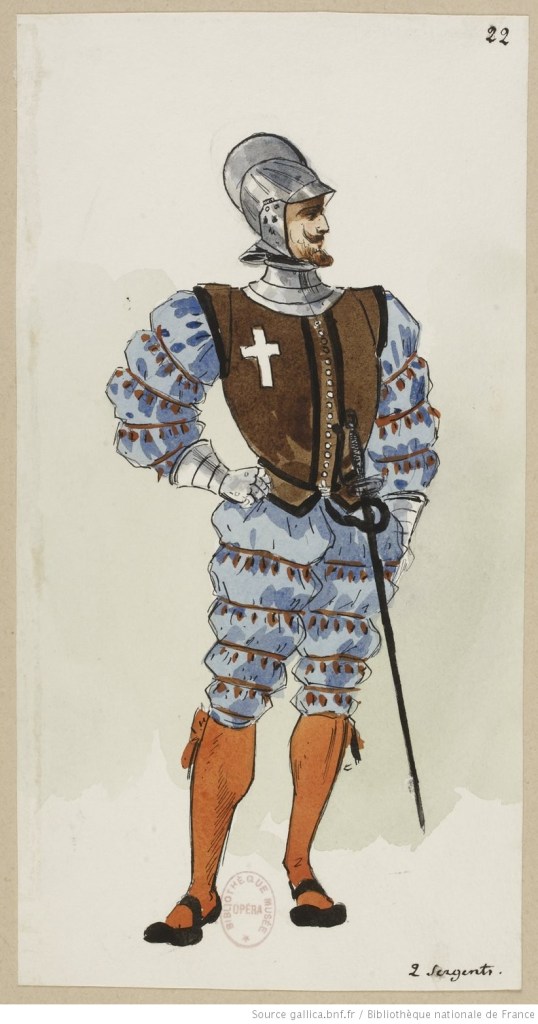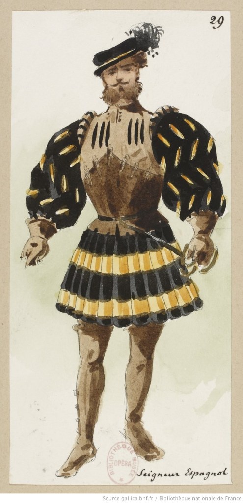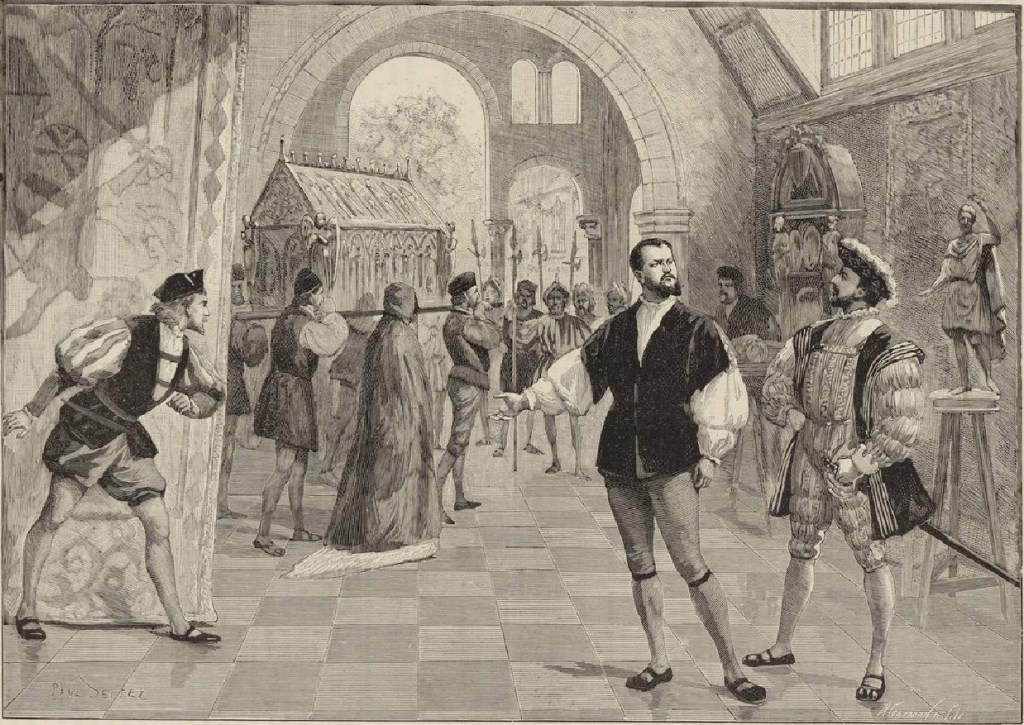 That first scene takes place in Cellini’s studio in Paris. There are some lovely melodies: Ascanio’s brief, rapt description of the woman he loves (“Si loin et si haut dans l’espace”); Benvenuto’s quasi-duet with Scozzone (“De l’idéal vers qui mon rêve pur me guide”); or the king’s praise for Benvenuto’s statue of Jupiter (“Voilà le pur chef d’œuvre, ami”), or his orders to the artist to devise festivities at Fontainebleau for the visit of Charles V. (Gounod considered the scene of the king’s visit a model of musical elegance and courtesy.) Note, too, the woodwinds and harps that accompany the king’s entrance – it evokes the Renaissance.