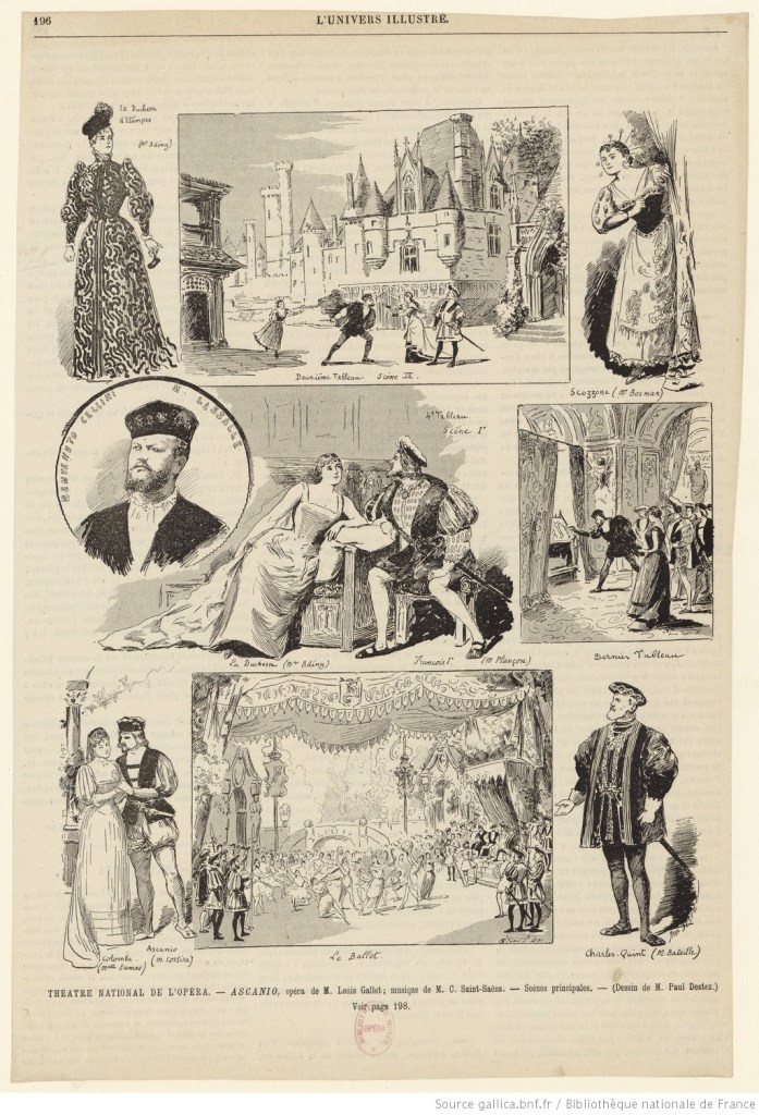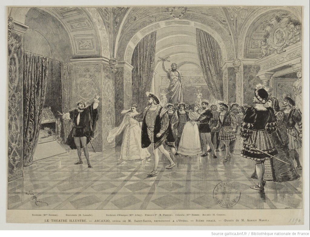 The dress rehearsal went poorly – “a veritable disaster,” H. Moreno (Le Ménestrel) said. “Everything interesting in the score passed almost unnoticed, and the cleverest hadn’t noticed much. … That’s because in Ascanio, there aren’t any great flights of fancy that grab you right away, and one has to come back twice to discover its charming intimacies.” Everyone predicted a disaster, Arthur Pougin (Dictionnaire des opéras) observed.