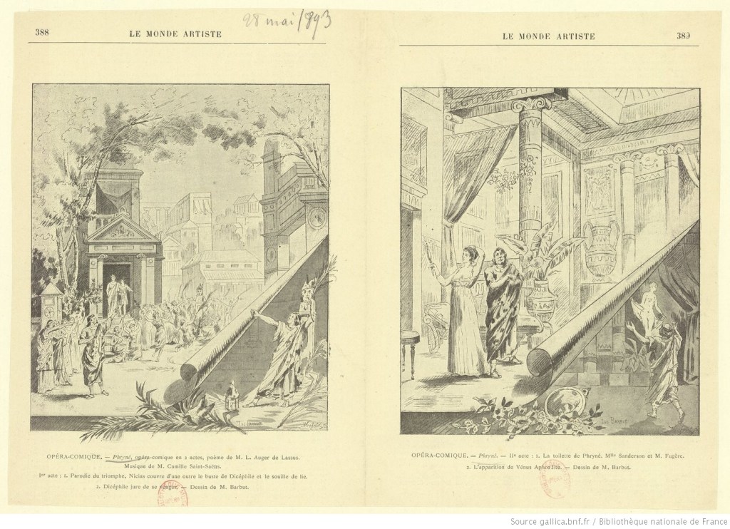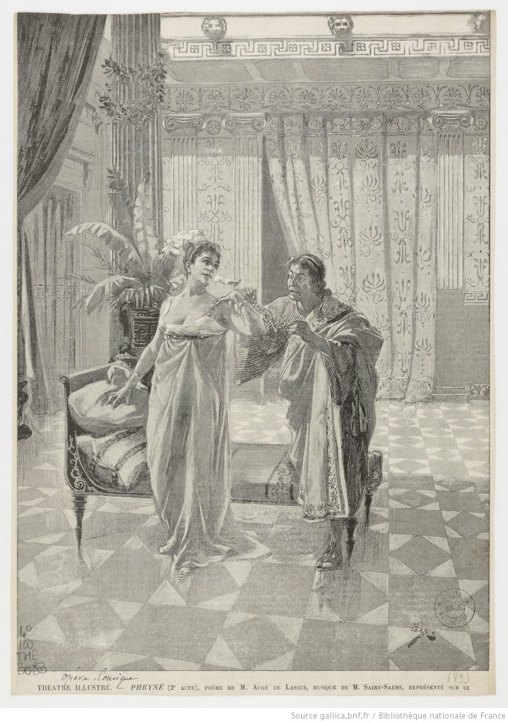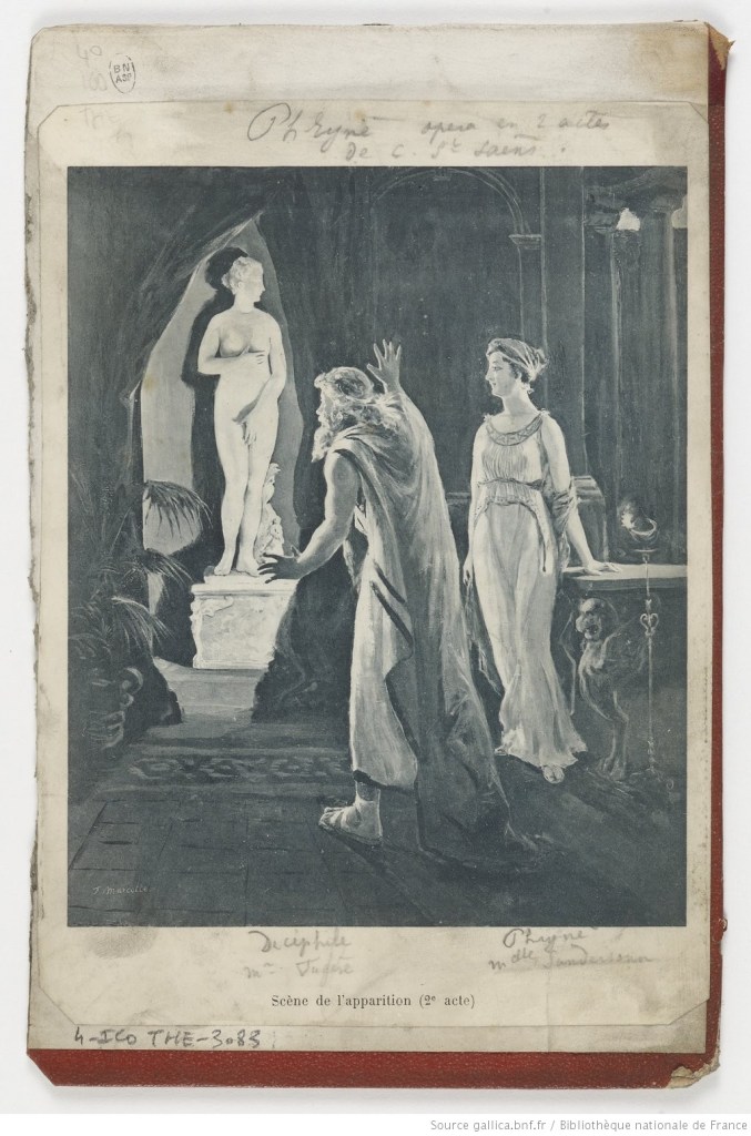 “There is nothing more alien to Wagnerian theories than [Saint-Saëns’s] score of Phryné,” wrote H. Moreno (Le Ménestrel). “The couplet flourishes there in abundance, alongside new romances and dolled-up duets; the choruses shine there, and the ensembles keep their symmetry; moreover, there are two rhythmic finales that would not disgrace the best operettas of the little masters of the day. Finally, it is something in the genre of the worst comic opera of Auber or even Ferdinand Poise, who never perpetrated anything more accomplished.”