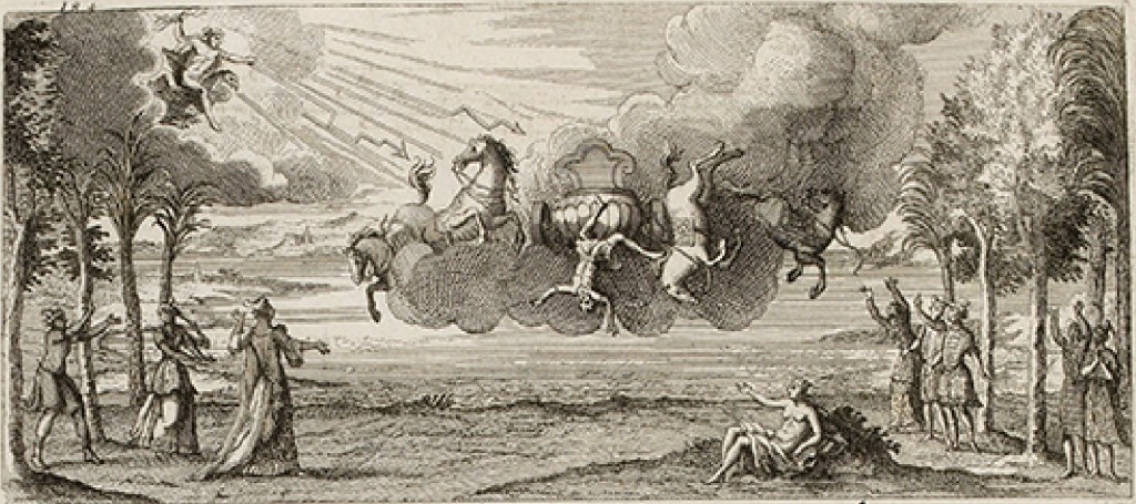 It goes without saying that Phaéton is a warning against the perils of ambition: the title character, obsessed with his own glory, tries to steer the chariot of the Sun (read: the ship of state and the reins of government); finds the task well beyond his meagre abilities; loses control; and is brought to earth with a catastrophic bump. Jupiter blasts him down with a thunderbolt: