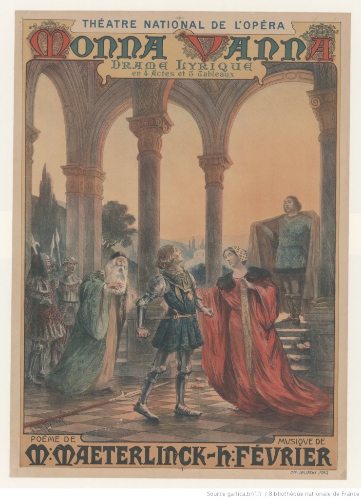 Maeterlinck again! But Monna Vanna was a departure for the Belgian Symbolist playwright. His 1902 play is a historical drama in the vein of Victorien Sardou; the characters’ motivations are clear; and the situations are strong and dramatic. Unsurprisingly, it was Maeterlinck’s greatest theatrical success. Pierre Kaminski (1001 opéras) believes this “well-made play”, designed to be successful, showed the decline of Maeterlinck’s artistic ambitions. But, for my money, it has a much better story than either Pelléas et Mélisande (Debussy, 1902) or Ariane et Barbe-bleue (Dukas, 1907), and its operatic adaptation is better musical theatre.
