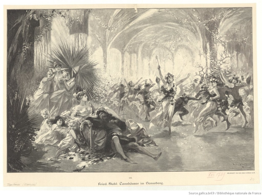 Act I opens in the Venusberg, where the goddess reclines on a couch; Tannhäuser, once her admirer, is sated with endless pleasure, and wants to return to the mortal world and to pain. For the Paris production, Wagner wrote a big ballet depicting a ‘Bacchanale’, verging on the pornographic: youths “pair and mingle” with naiads, Bacchantes “excite the lovers to increasing licence”, and “the revellers rush together with ardent love-embraces”, before Cupids shower them with arrows.