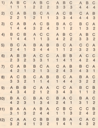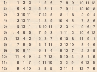 According to this statistic, relationships can be identified among the twelve fundamental rows, based on both position (A, B, C) and membership in the groups of three (1, 2, 3, 4). Based on positions, the rows 1, 2, 3, 7, 8, 10 are related, as they contain three different positions within each group of three. The rows 6, 9, 11, 12 are also related; they use two different positions within each group of three, with one position being duplicated. The rows 4 and 5 are mixed rows, each being half-related to both of the other circles: in one half, they use two positions, while in the other half, they use three positions. Based on their membership in specific groups of three, the following relationships can be observed: