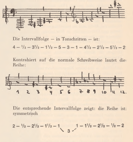 The twelve tones of the scene sequence form the initial tones of twelve fundamental rows, each providing the musical material for the first twelve of the fifteen opera scenes. The fundamental rows are derived through permutation from the all-interval series. Numerically represented, it is as follows: